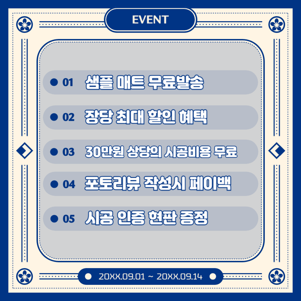 10월 한정 Event 관리자 조회수: 283회 2025-07-08 풍성한 한가위, 마음까지 넉넉해지는 혜택! 보름달처럼 가득 찬 혜택, 지금 바로 만나보세요😘 « 이전글: [샘플 매트 무료 발송]